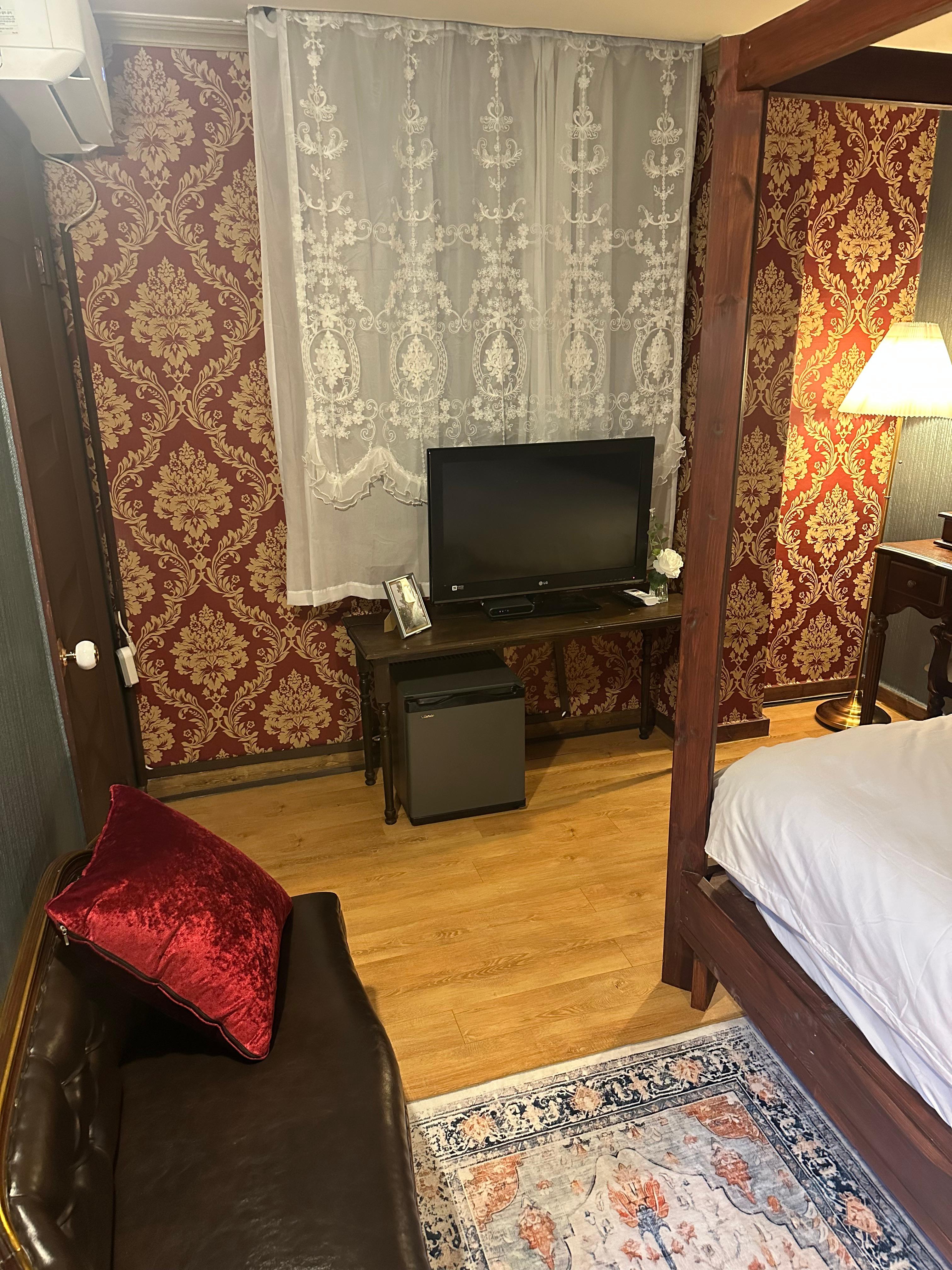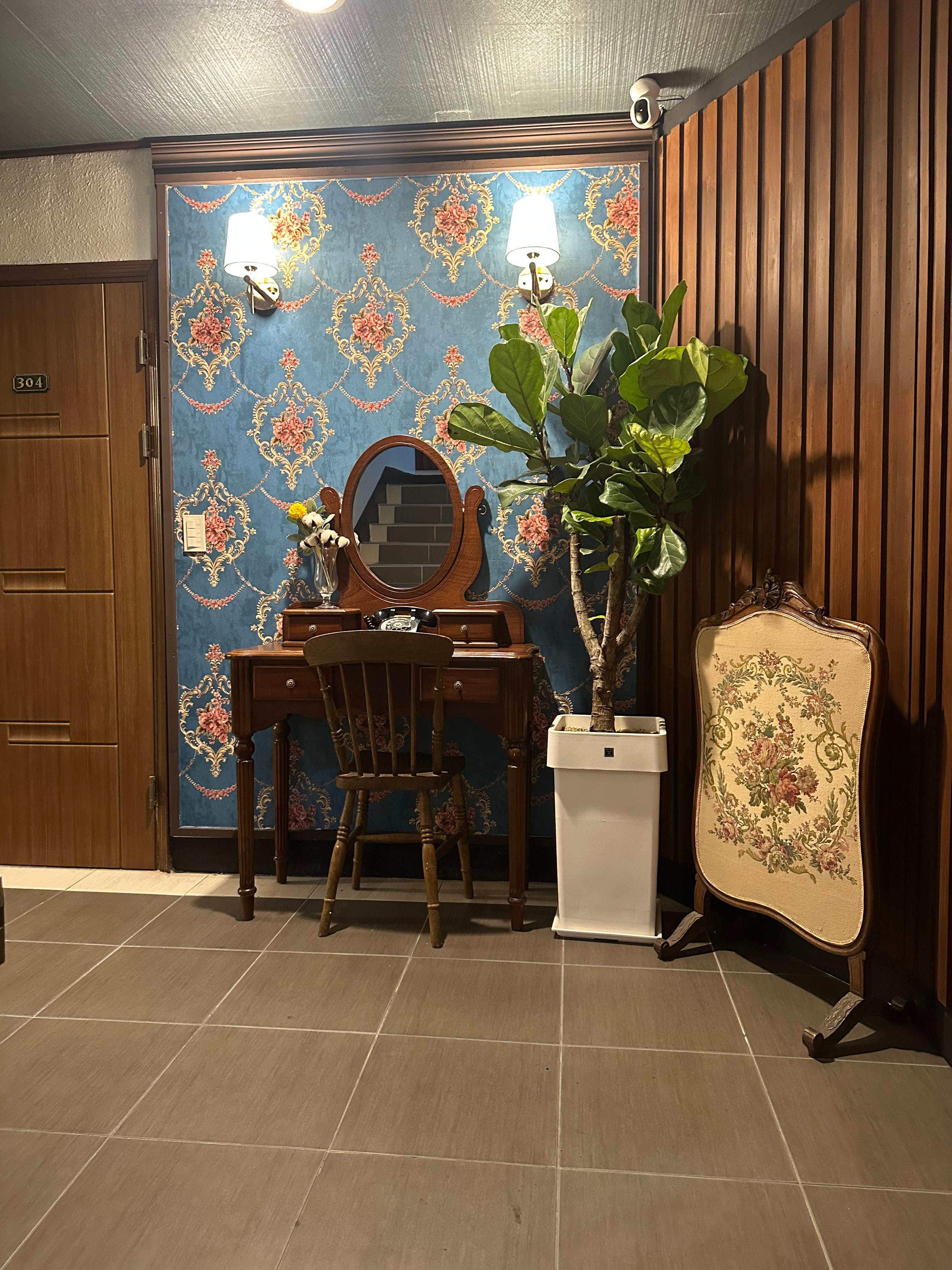 입구부터 가구, 장식품, 소품 하나하나가 마치 옛날로 시간 여행을 온 듯한 느낌을 주었습니다. 평범한 호텔과는 완전히 달라서, 들어서자마자 여행의 설렘이 배가되더라구요.